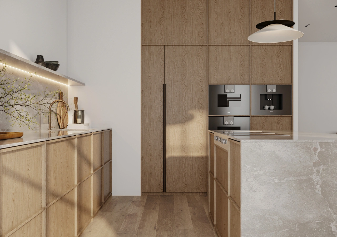 A handleless oak kitchen reads especially serene when the palette stays light: natural oak veneer paired with a pale countertop tone. This approach works well for modern homeowners who want a Scandinavian feel without going cold.