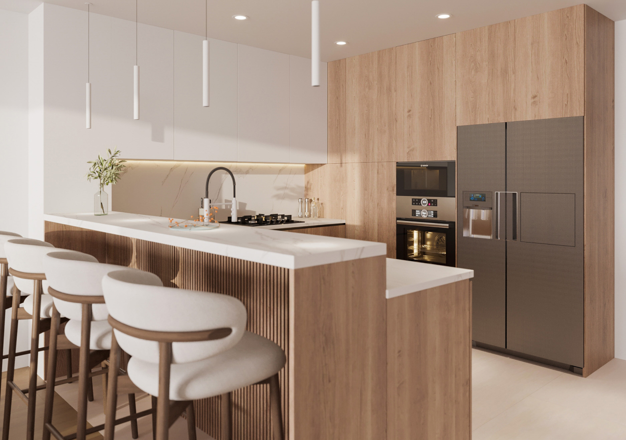 When you remove ornament, the kitchen becomes material-forward. Proportion, lighting, and finish quality do the heavy lifting. Warm minimalism works because texture replaces “stuff,” so you get depth without clutter.