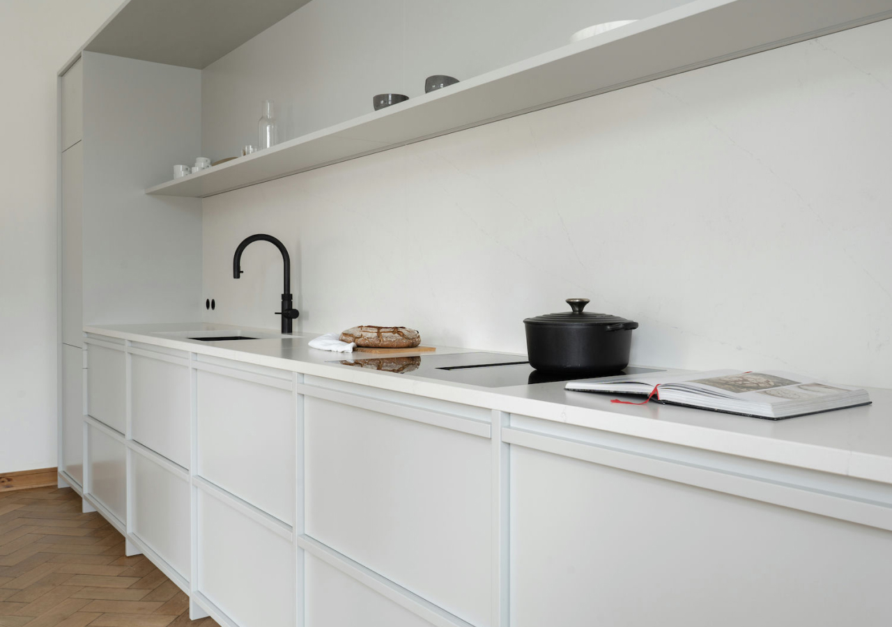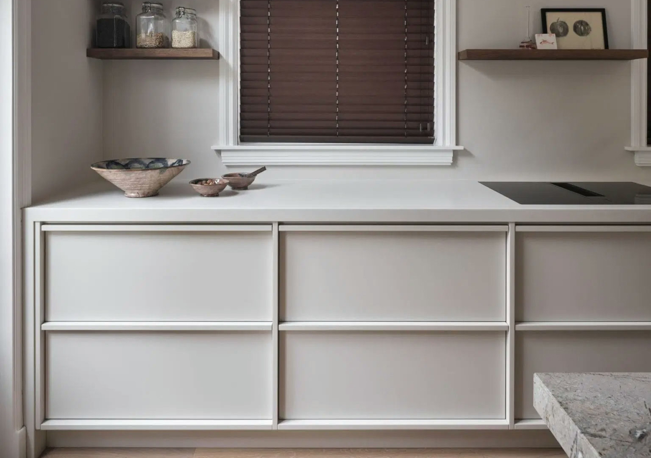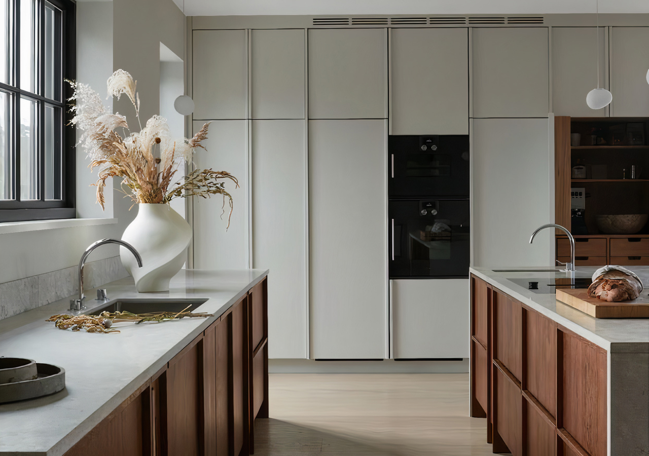 Handleless cabinetry also helps. Recessed profiles, integrated rails, or carefully detailed edge pulls reduce visual clutter and keep the surfaces uninterrupted. In a style that depends on low visual noise, those small details make a real difference.