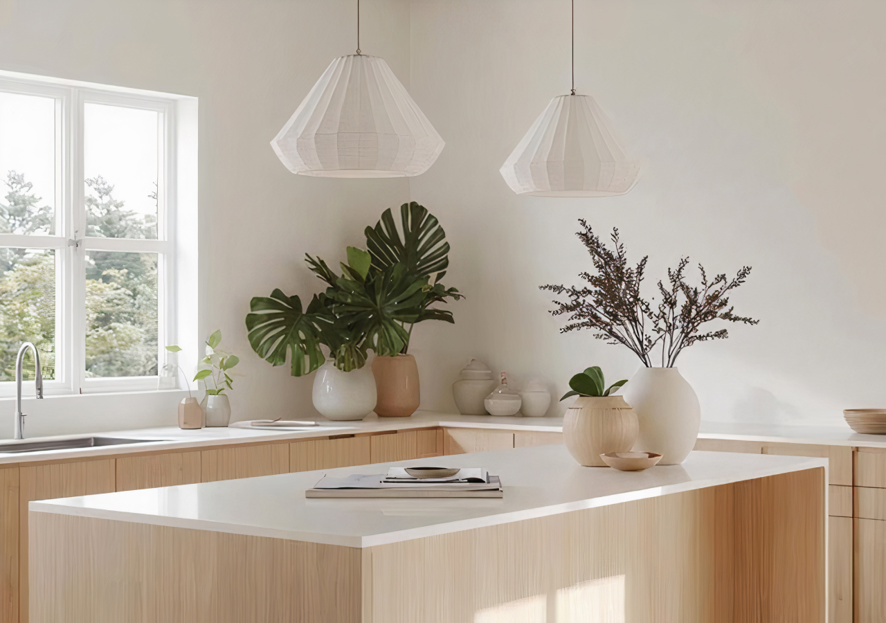The strongest versions of this style are usually the simplest in structure: warm white cabinetry, one clear wood tone, low-glare finishes, practical storage, and lighting that supports the room instead of flattening it. When those pieces are handled well, the kitchen feels light without becoming cold and minimal without becoming severe.