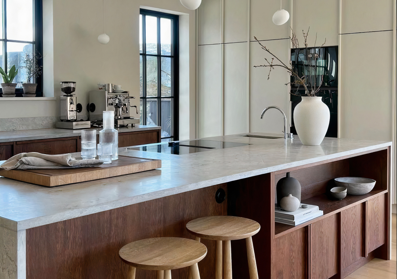 Stone surfaces can help tie the palette together. Light quartz or Dekton with soft movement can bridge white cabinetry and wood tones, especially when the backsplash and countertop are treated as one continuous surface.