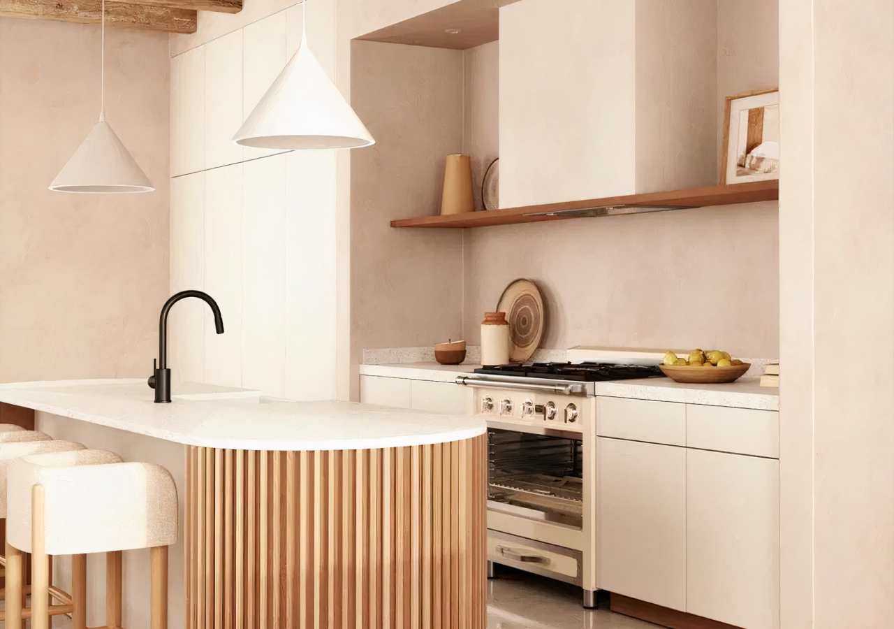 White Japandi kitchens combine warm white cabinetry, natural wood, matte finishes, and restrained detailing to create spaces that feel bright without feeling cold. Unlike a stark all-white kitchen, this style relies on undertone, texture, and storage planning to keep the room soft, usable, and visually quiet.