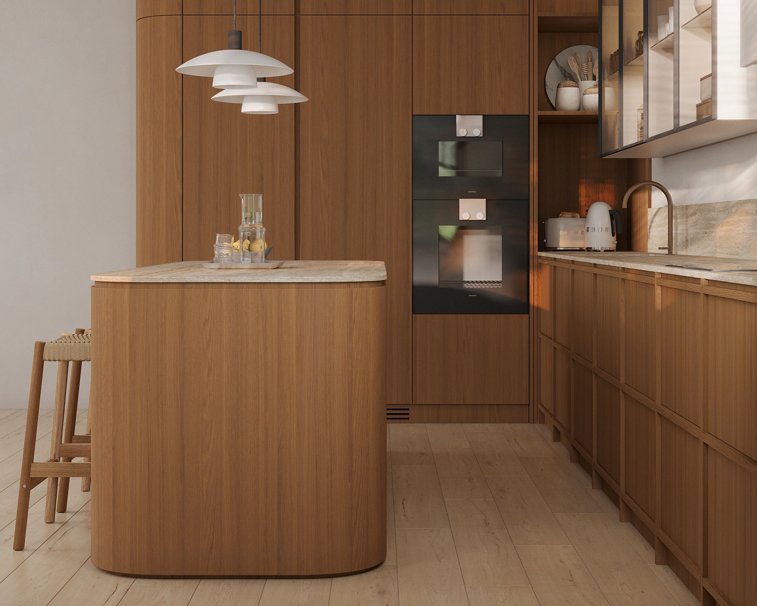Inspired by light, warmth, and gentle curves, this Japandi kitchen embodies calm elegance with its sculptural cabinets and softly rounded island forms.