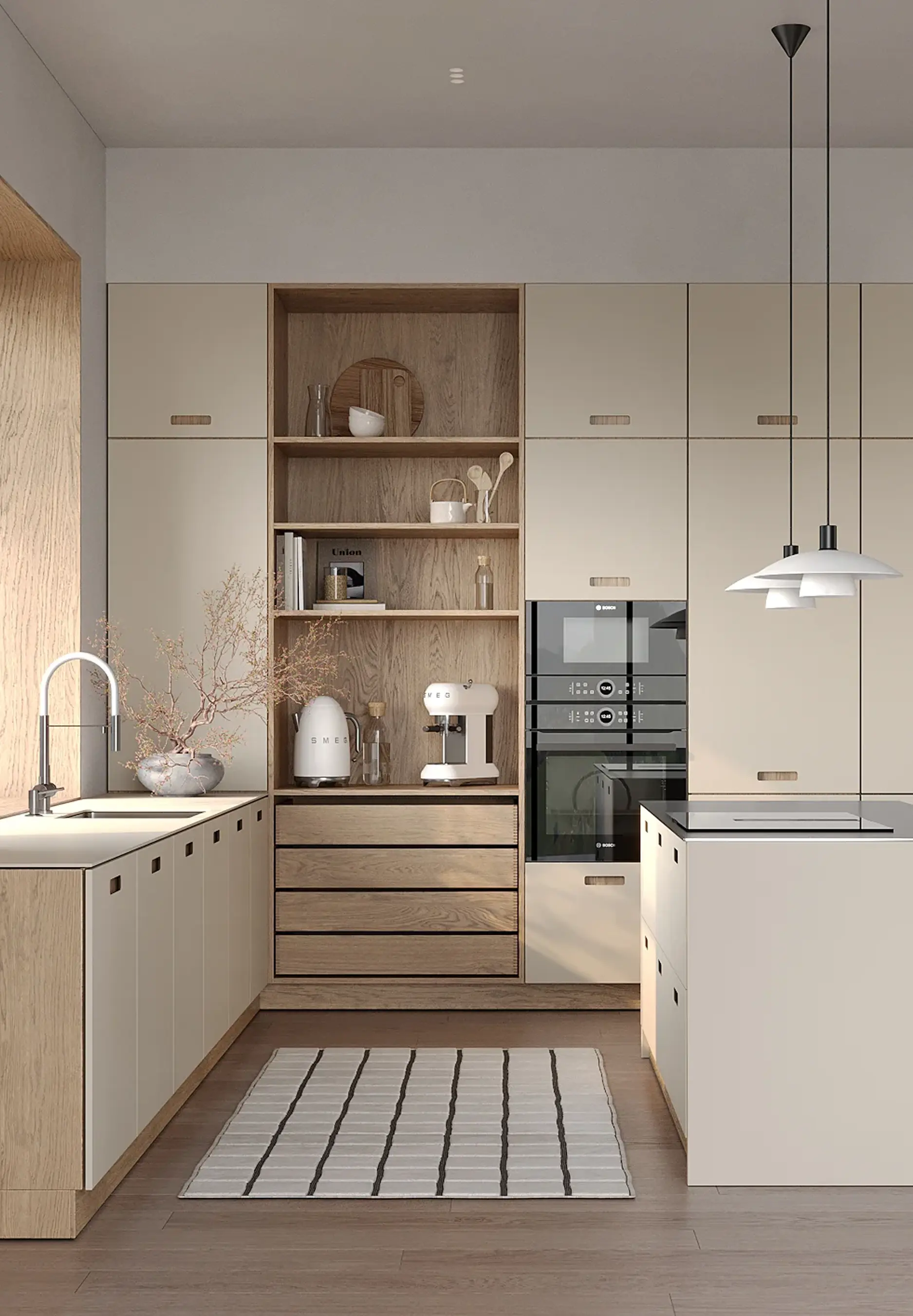 A light beige kitchen built around oak tones and soft neutrals, designed to keep the space bright and visually open.