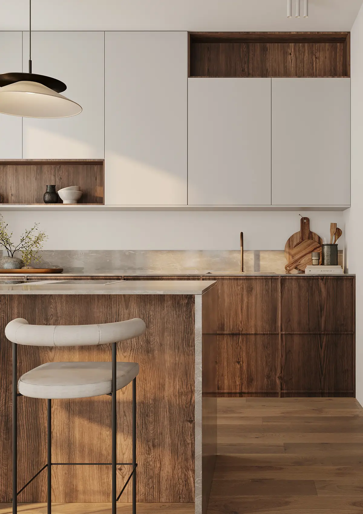 A layered beige kitchen combining wood, stone, and soft neutrals to create a calm and balanced palette.