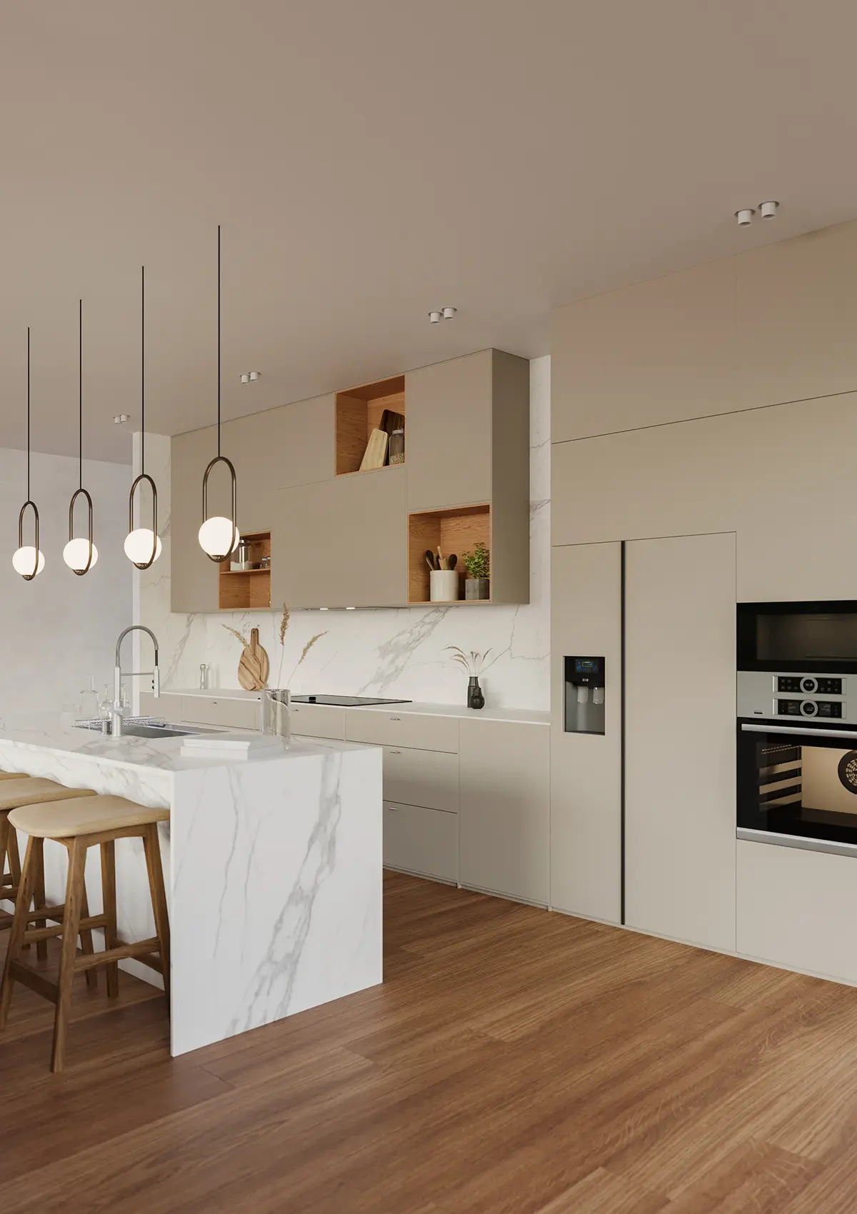 A modern beige kitchen with integrated handles and clean cabinet lines, where soft tones are paired with a more structured layout.