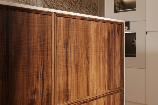 A more structured European kitchen with deeper tones and clean lines, designed for clarity and precise layout.