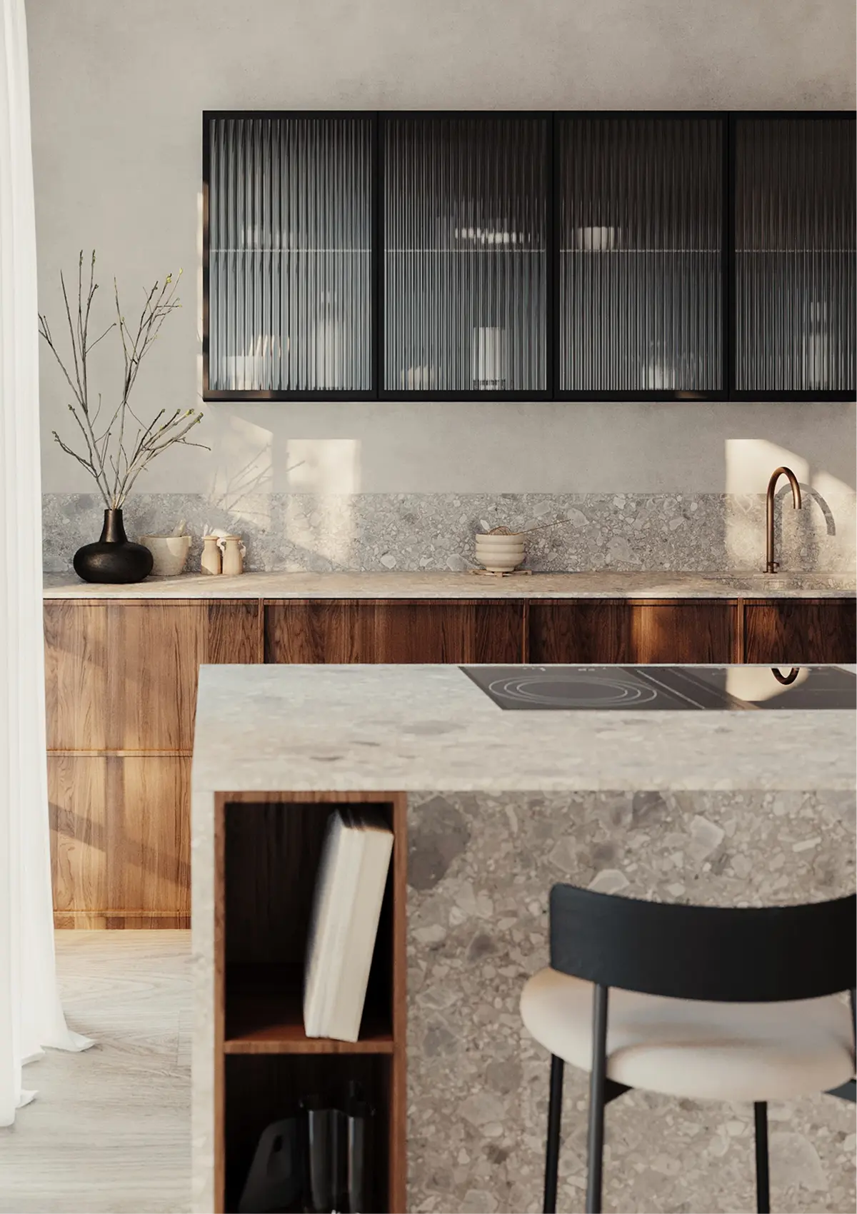 A lighter European kitchen approach with natural materials and a restrained palette that keeps the space open and easy to use.