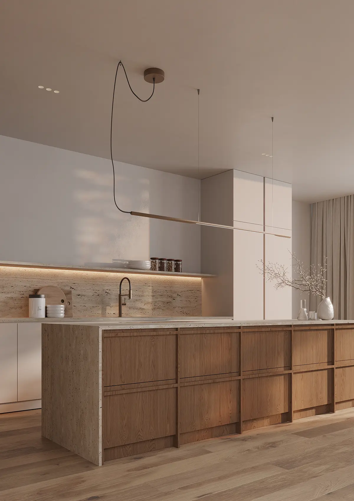 Japanese kitchen design in a unique style that takes simplicity to its fullest extent. Unlike Japandi, which strives for perfection, the Wabi-Sabi-style kitchen embraces irregularities and imperfections, reflecting another core aspect of Japanese design philosophy.