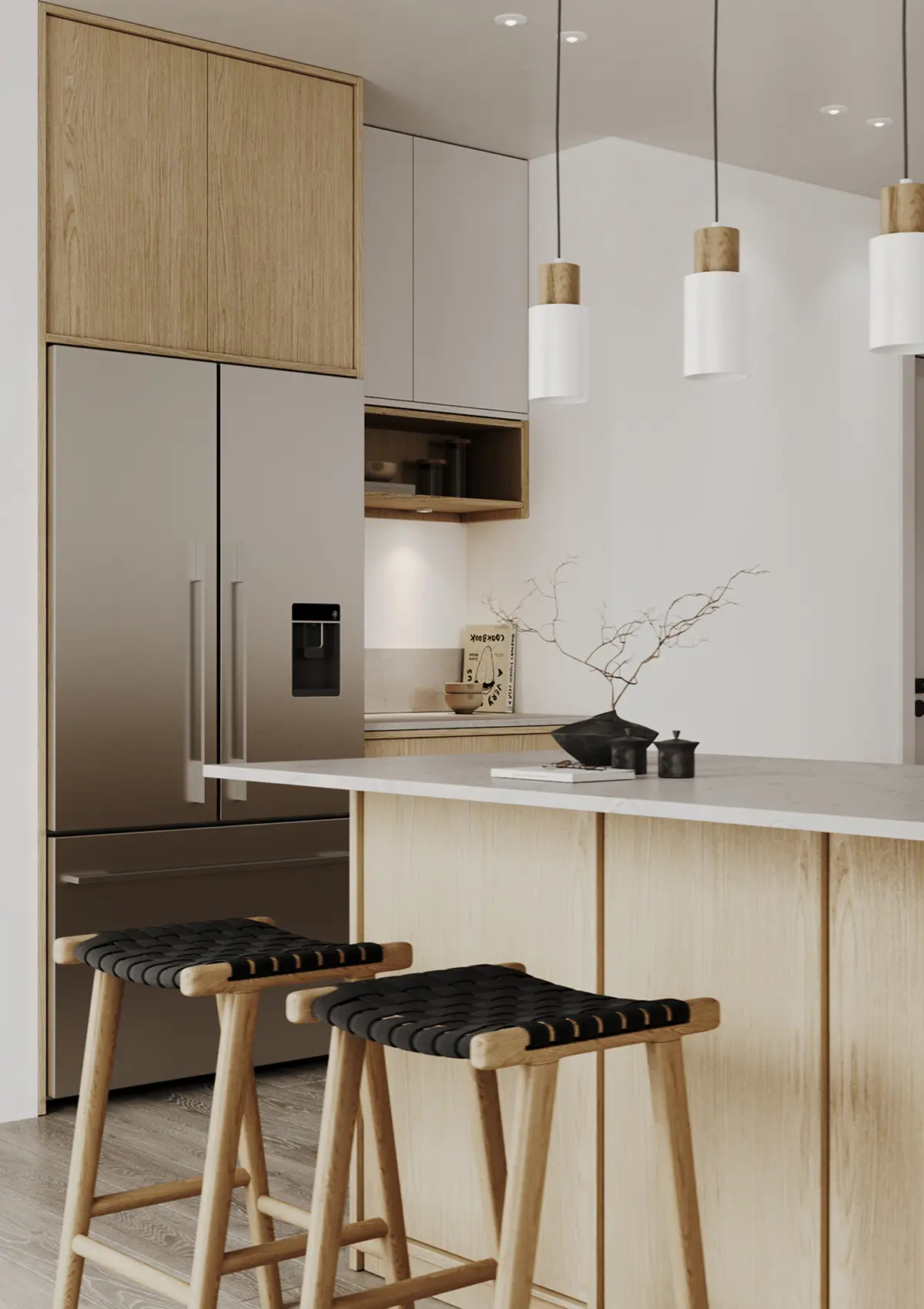 A minimalist Japanese kitchen with light wood tones and reduced detailing, designed to keep the space visually calm and consistent.