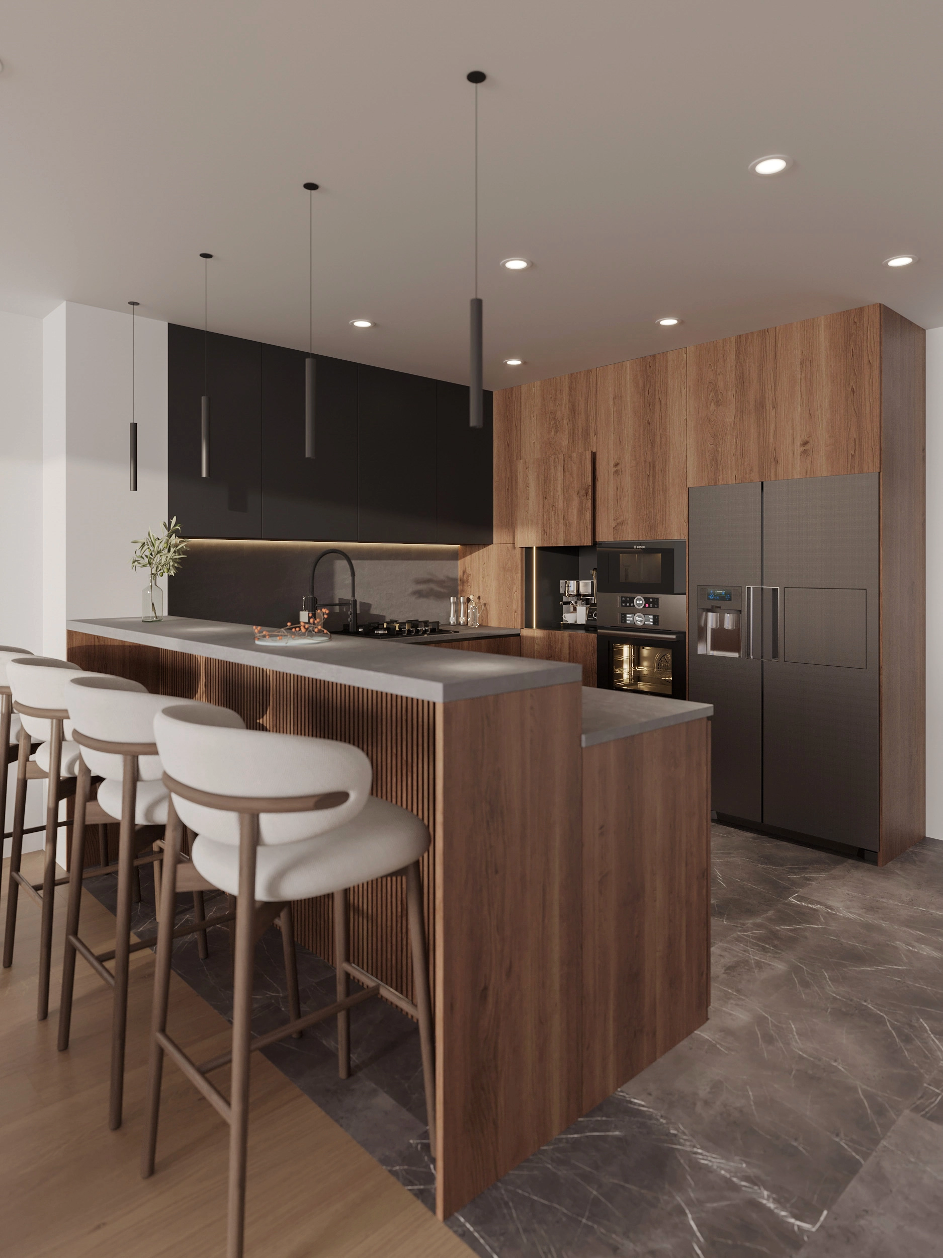 Inspired by light, warmth, and gentle curves, this Japandi kitchen embodies calm elegance with its sculptural cabinets and softly rounded island forms.